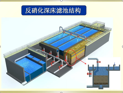 反硝化深床滤池是一种能同时去除TN(总氮)、SS(悬浮物)、TP(总磷)的生物滤池系统,滤料采用特殊规格及形状的石英砂或改性陶粒,依靠滤料上生长的反硝化优势菌种的生物作用完成TN(总氮)的去除,深床滤池本身具有过滤功能可以去除SS(悬浮物),同时可根据水质情况通过投加PAC实现TP(总磷)的去除。